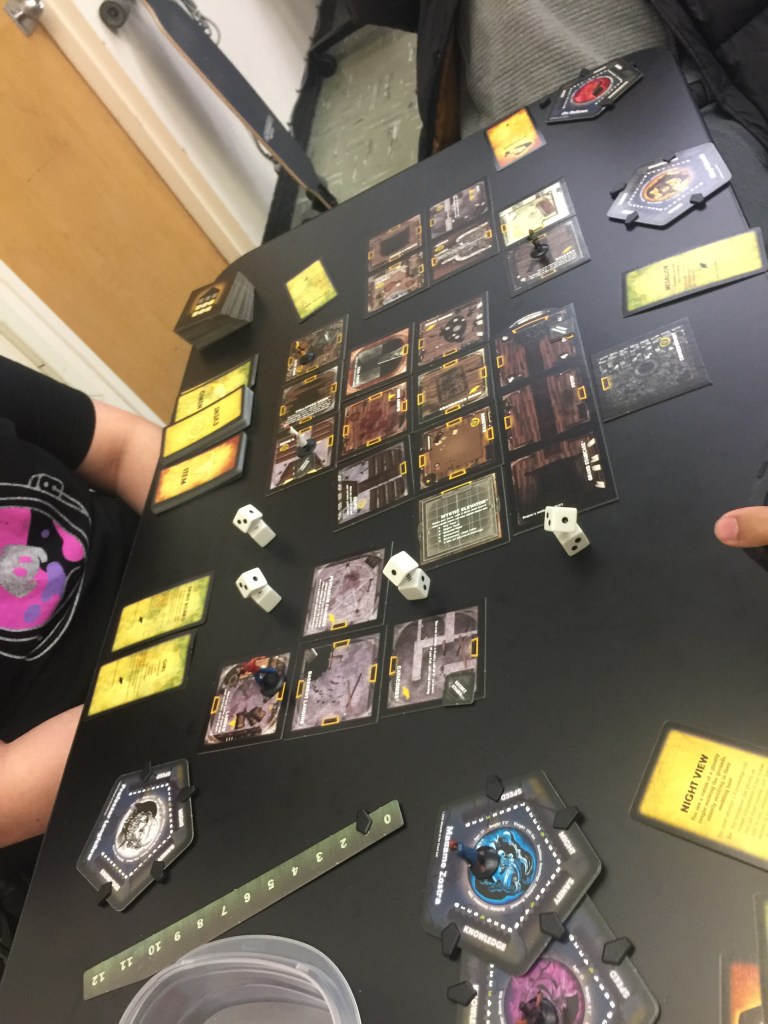 During the first couple of rounds we did the normal finding rooms and discovering events with each new room discovered. The first round that happened was when Josh found the ballroom and got pulled into its walls and got spit up into the pentagon chamber room. Right afterward, I found a vault and was able to successfully lock pick it and gain two very helpful artifacts named candle (let me roll an extra dice on every event roll) and a rabbits foot(that lets me replace any roll i make into a 5 one time). Afterward Carlos found an abandoned room with a girl where he became the first person to roll for omen (the player rolling must roll higher or equal to the number of times someone had to roll for omen, if they fail they become the betrayer). Since he was the first he easily rolled higher than 1 from the 4 dices he had since his sanity was 5. Events like this happened until eventually I unfortunately found an omen room and had to roll for omen. At that time we automatically made it 12 so that the game would end faster and rolling 6 dices with a max of 2 each, it was next to impossible. After failing, I became the Betrayer and the second part of the game happens, the HAUNT. In this part of the game of the many scenarios we could the scenario chosen was #25 entitled the voodoo haunt. For this hunt the rules go as follows: the betrayer must kill the at least half of the heroes to win and at the end of his turn different effects happen to each hero based on the chosen voodoo dolls placed on them by the betrayer; The heroes must go into a room on each of their turns and try to find a voodoo doll based on a quote that hints to where their voodoo doll might be; if the heroes are able to destroy all the voodoo dolls, they win. As the betrayer i chose each persons voodoo doll t goes as the following: Carlos = wax doll with the effect that he takes 1 physical damage, Josh = China doll where he must roll 4 dices and roll more than the number of turns after the haunt or else he DIES, Sergio = Rag doll where he must roll for intelligence and roll more than the number of turns after the haunt or else he takes 2 physical damage. At first it turned into a cat and mouse chase as I try to catch them to hurt them while they are trying to find the voodoo dolls. During turn 3 they were able to find the Wax doll inside the Kitchen thus freeing Carlos from its curse. During turn 4, Josh was unable to succeed in rolling a 4 so he DIED. And during the 5th and final round I caught up to Sergio and attempted to hit him for physical damage, however, he used a dynamite (an artifact he found in one of the events). Instead we both rolled dice and if its over 5 they dont take damage. Luckily i didn’t take damage but sergios artifact backfired and he took 4 damage by his own artifact, leaving him with 1 life. Then at the end of my turn he had to roll over 5 with 4 dice and was unsuccesful, giving me, the betrayer, the win since 2 of the 3 heroes are now dead. GG.