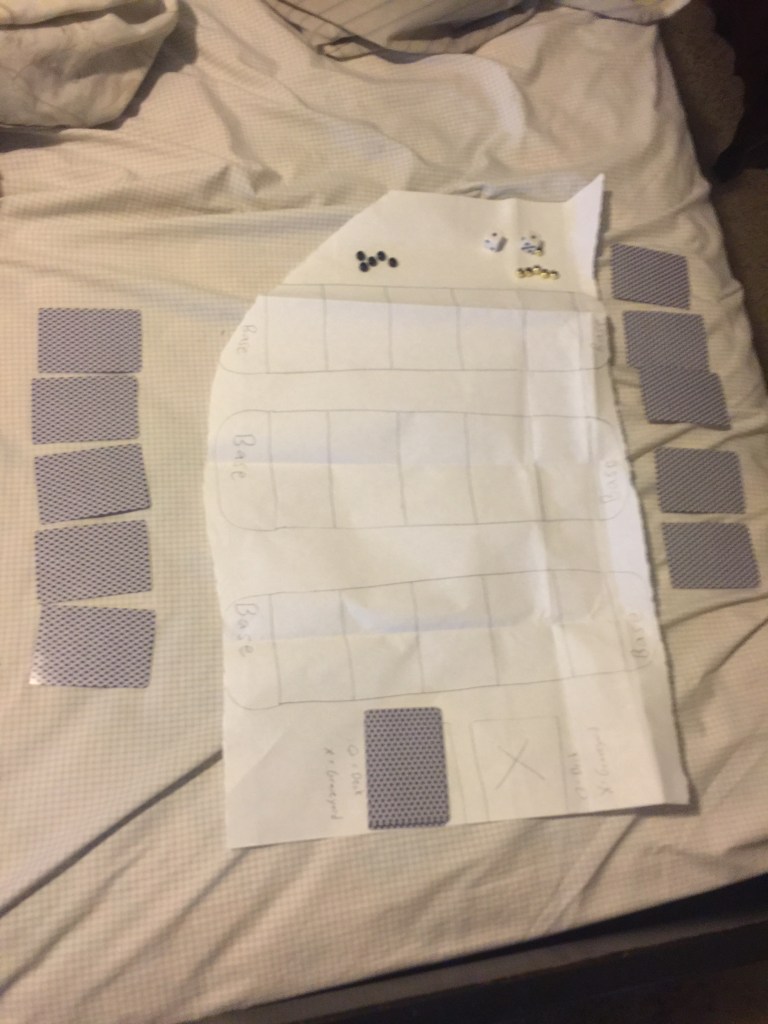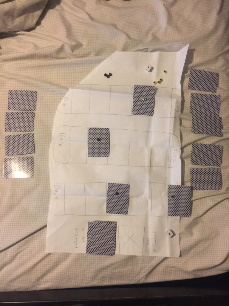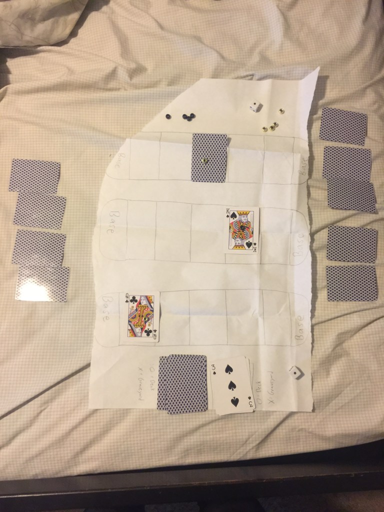 The first time i played this game was in class with one other classmate. During this game we conducted the rules above except we tried playing it playing up to 10 points and including 4 as a card you can draw in the deck. During this game i saw that soldiers were able to get to the other base quicker than i initially thought making it easier to reach opponents base. Also noticed how we both had more movement cards than soldiers so i saw that taking out the 4 cards could be beneficial. By taking out the 4 cards there was an even split between soldiers and movement cards. Also we noticed getting to 10 pts took longer than expected during out game so we thought to reduce it to 7.